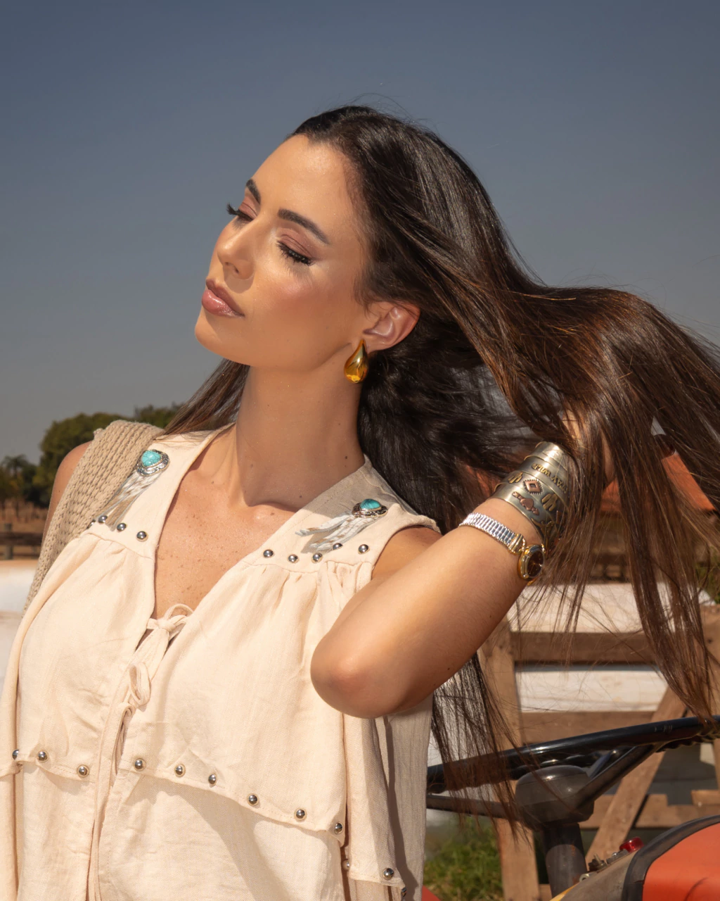 Encante-se com o Colete Wild Horses, feito em tecido fluido e com amarrações que valorizam o corpo. Suas duas camadas de babado, finalizadas com tachas, trazem movimento e charme à peça. As aplicações de metais western e a franja em couro legítimo completam o visual, combinando rusticidade e elegância. Ideal para quem busca autenticidade e conforto em um look cheio de personalidade.